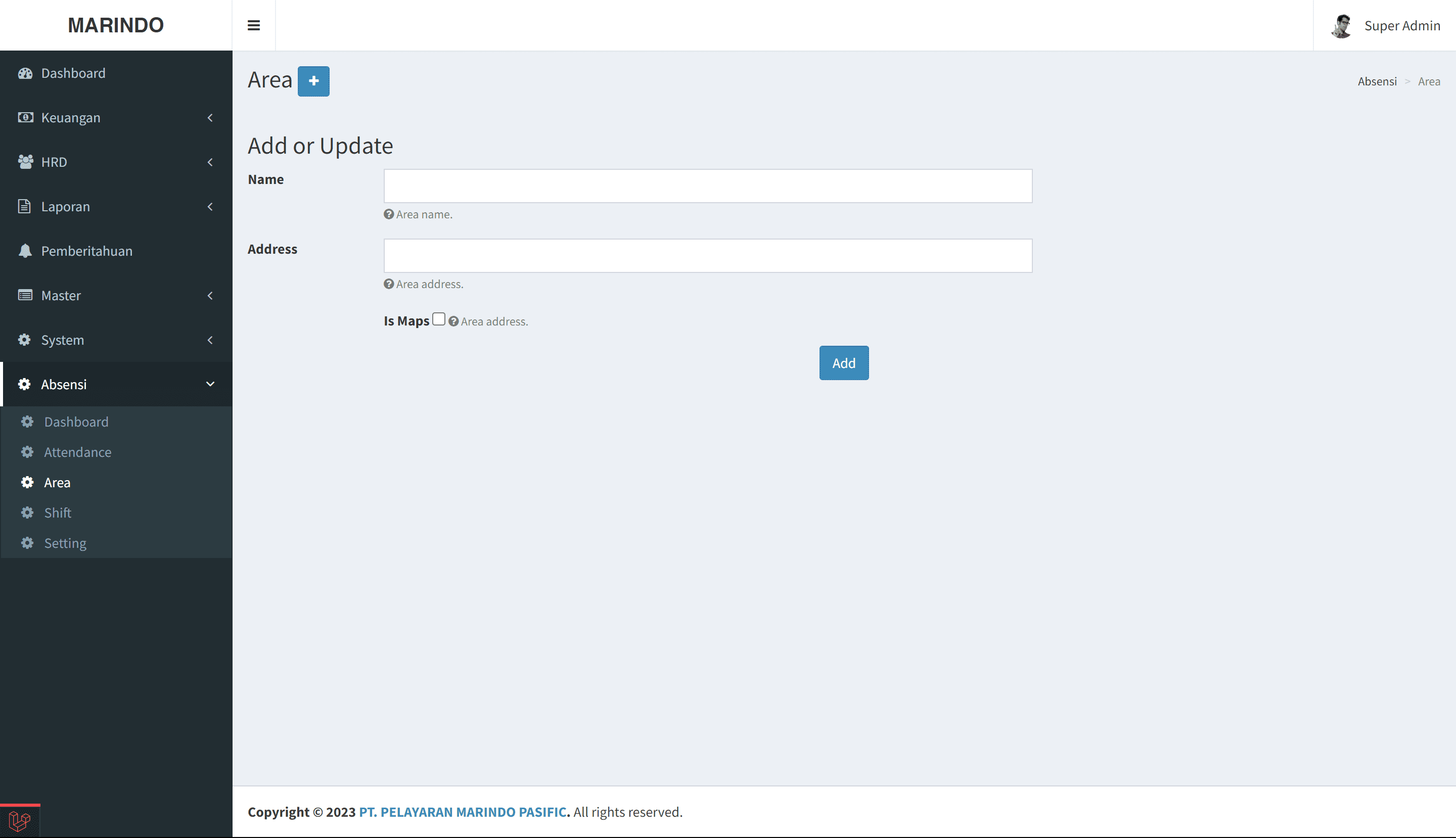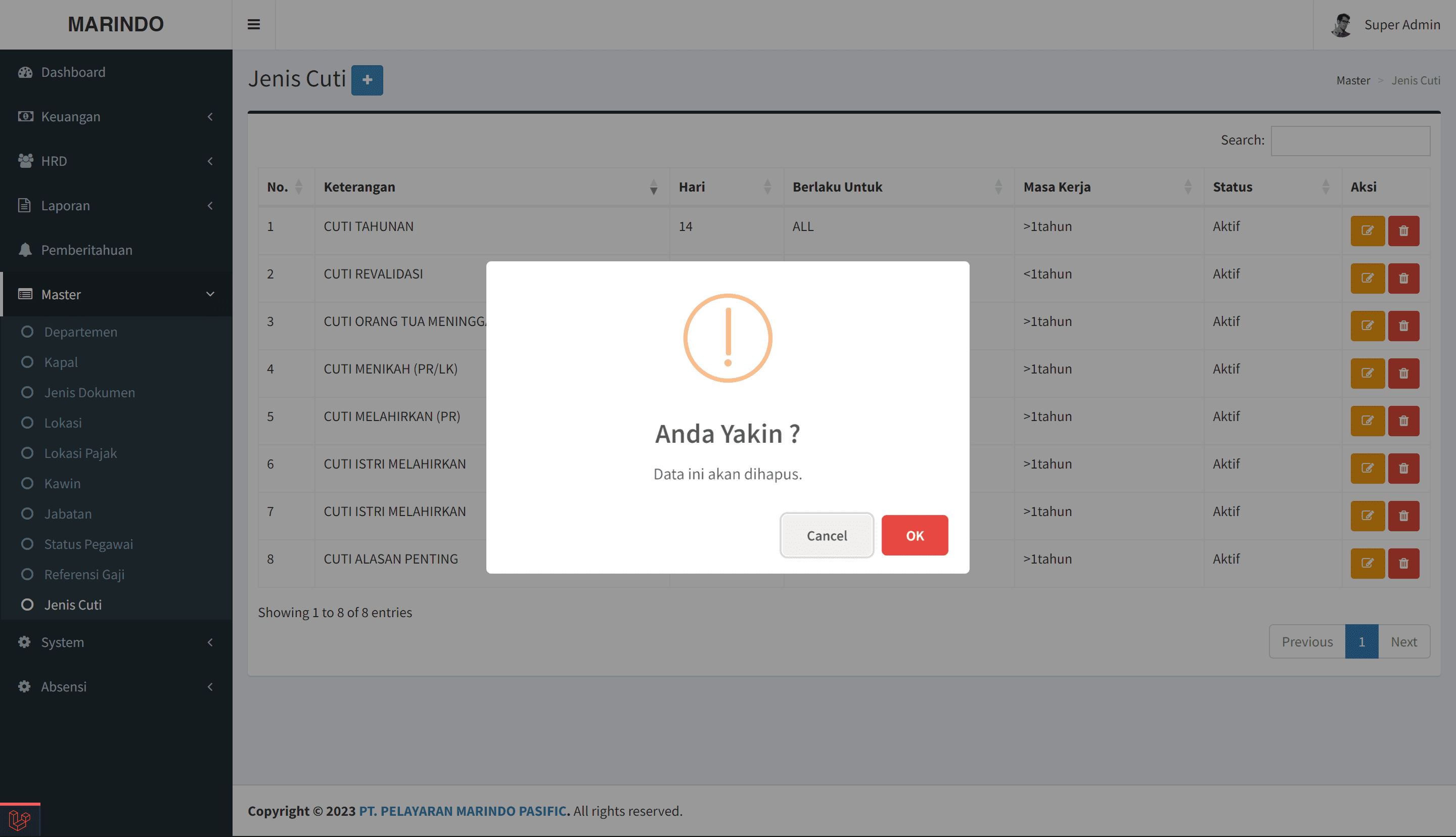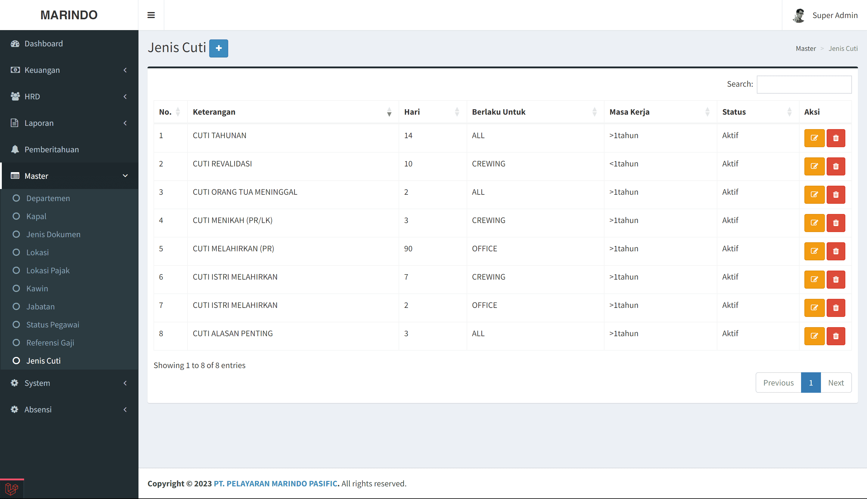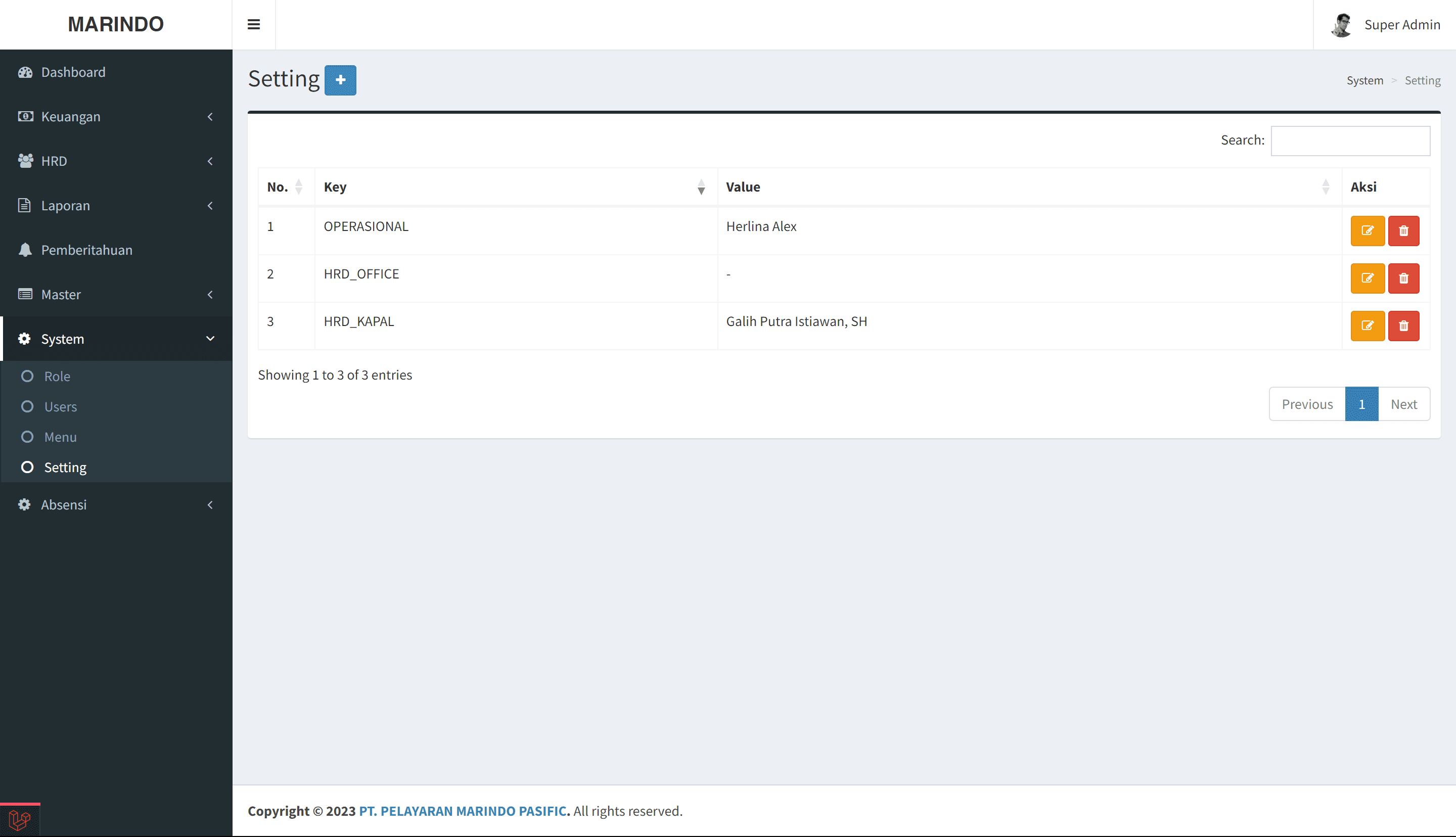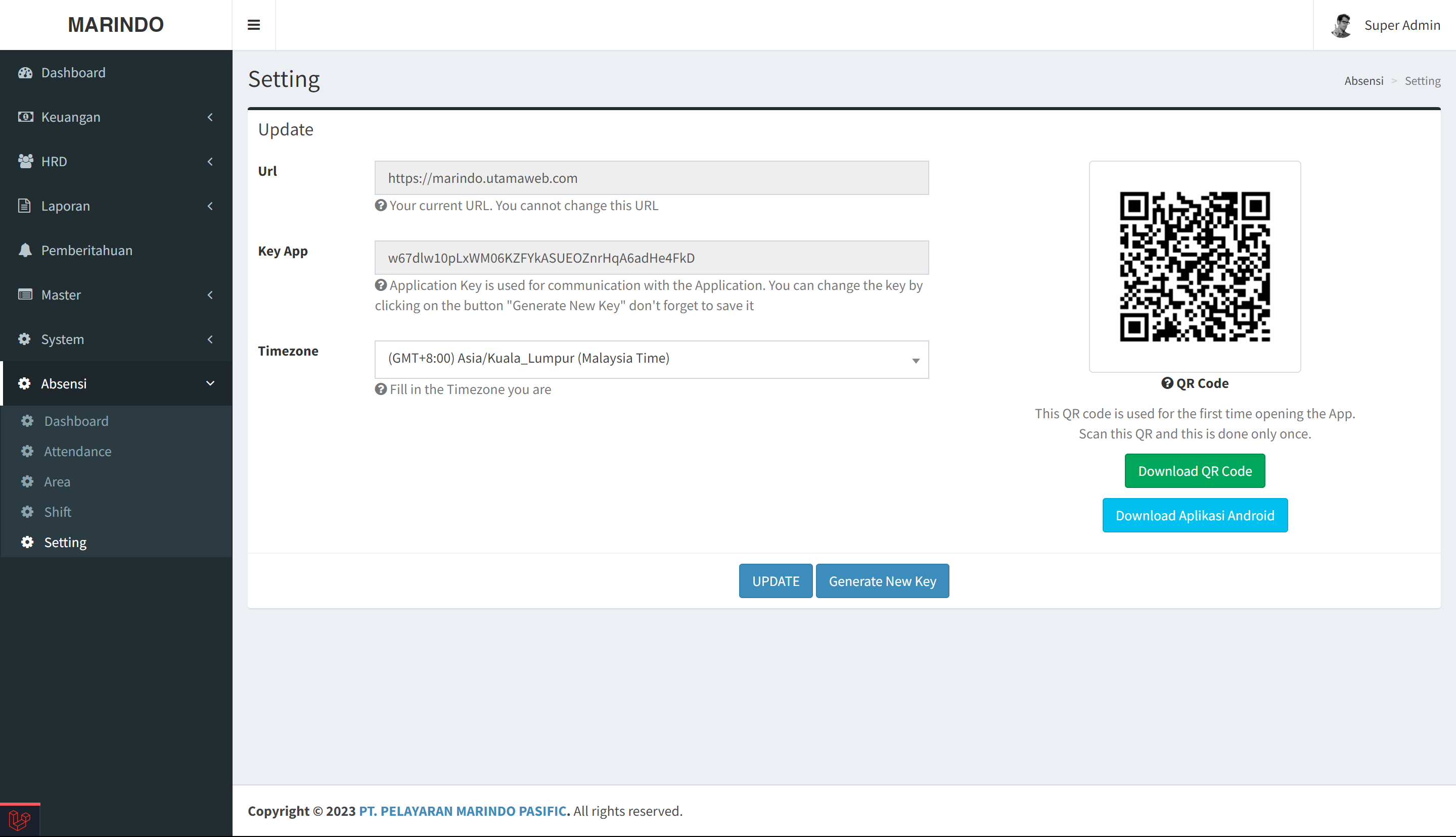 Data pengaturan absensi untuk MARINDO PAYROLL