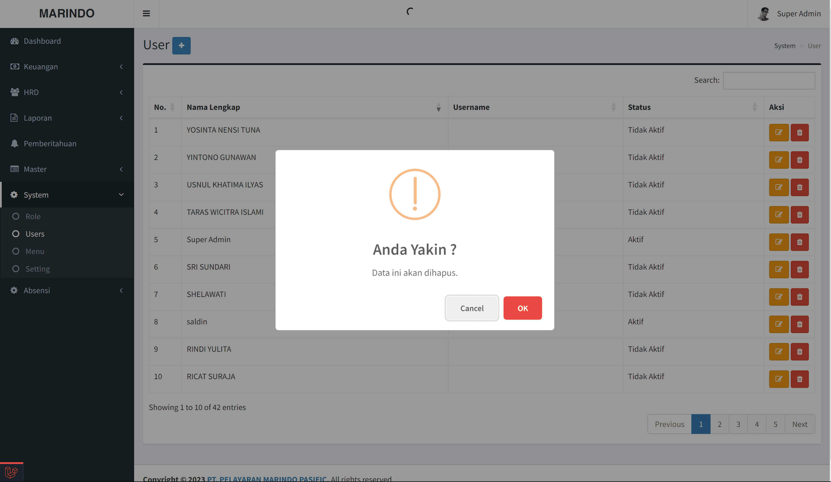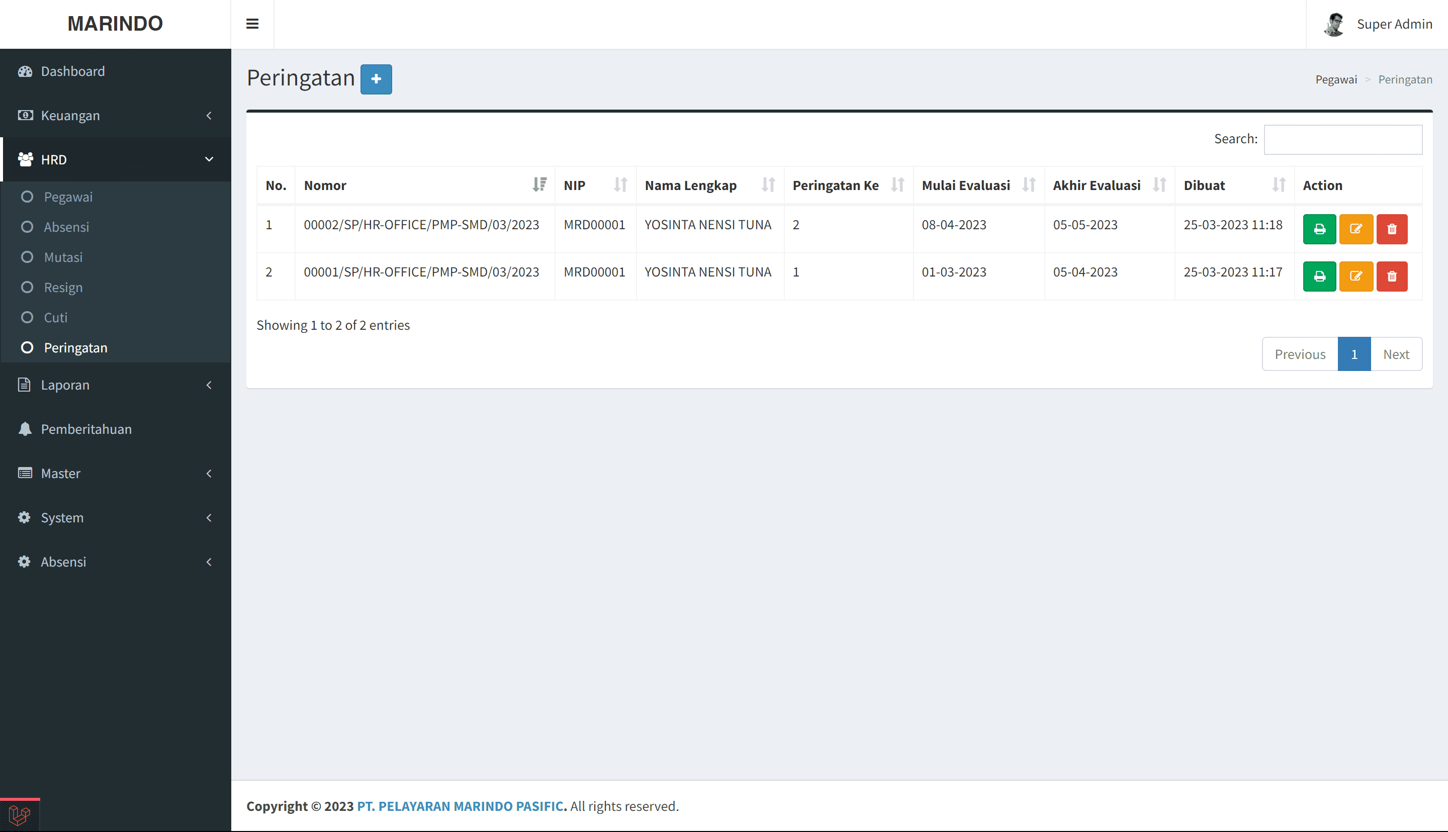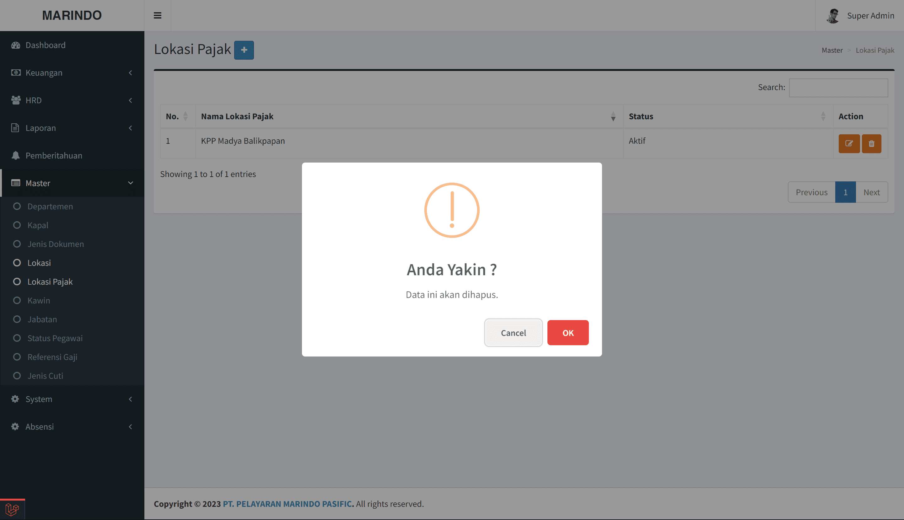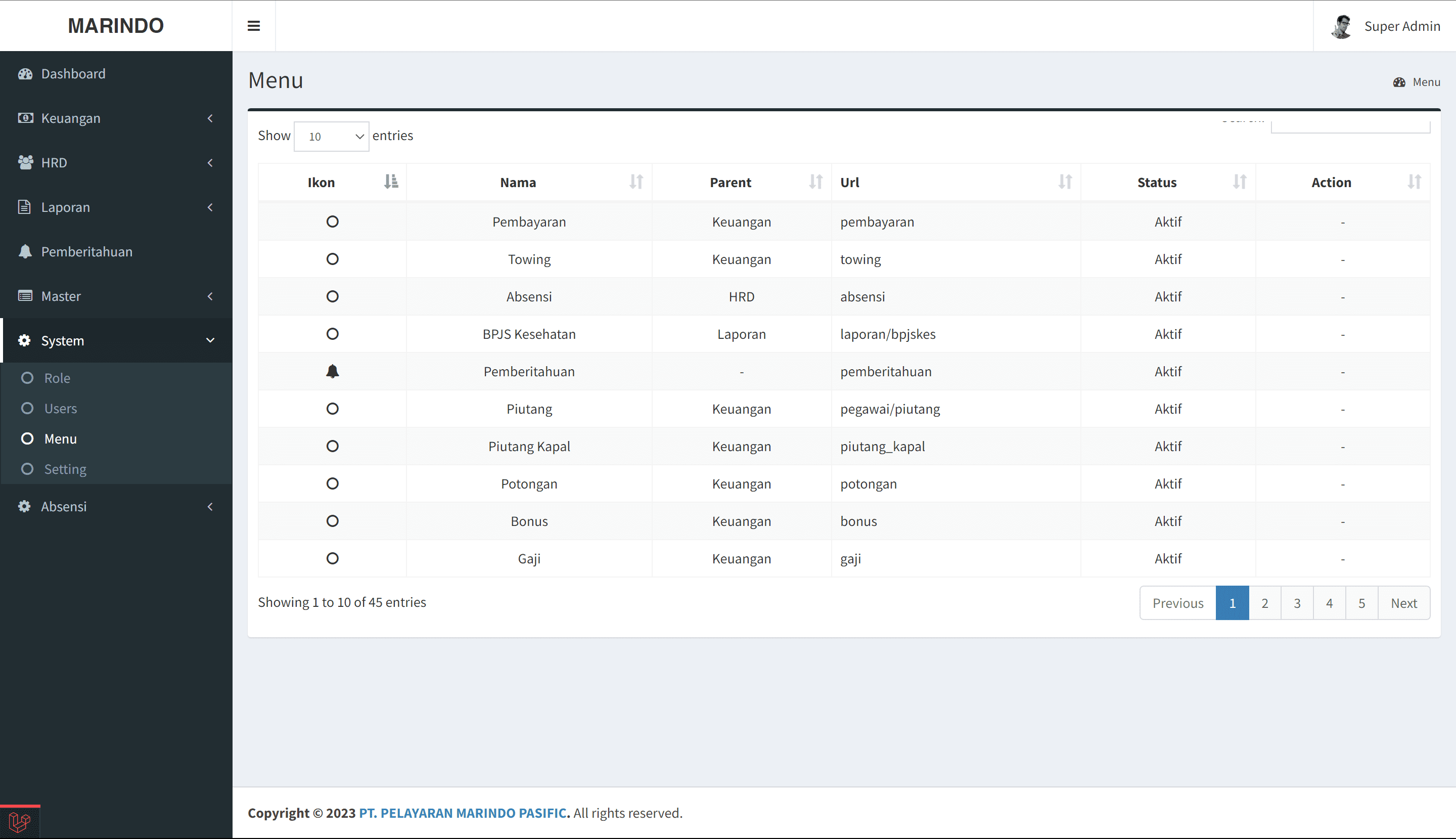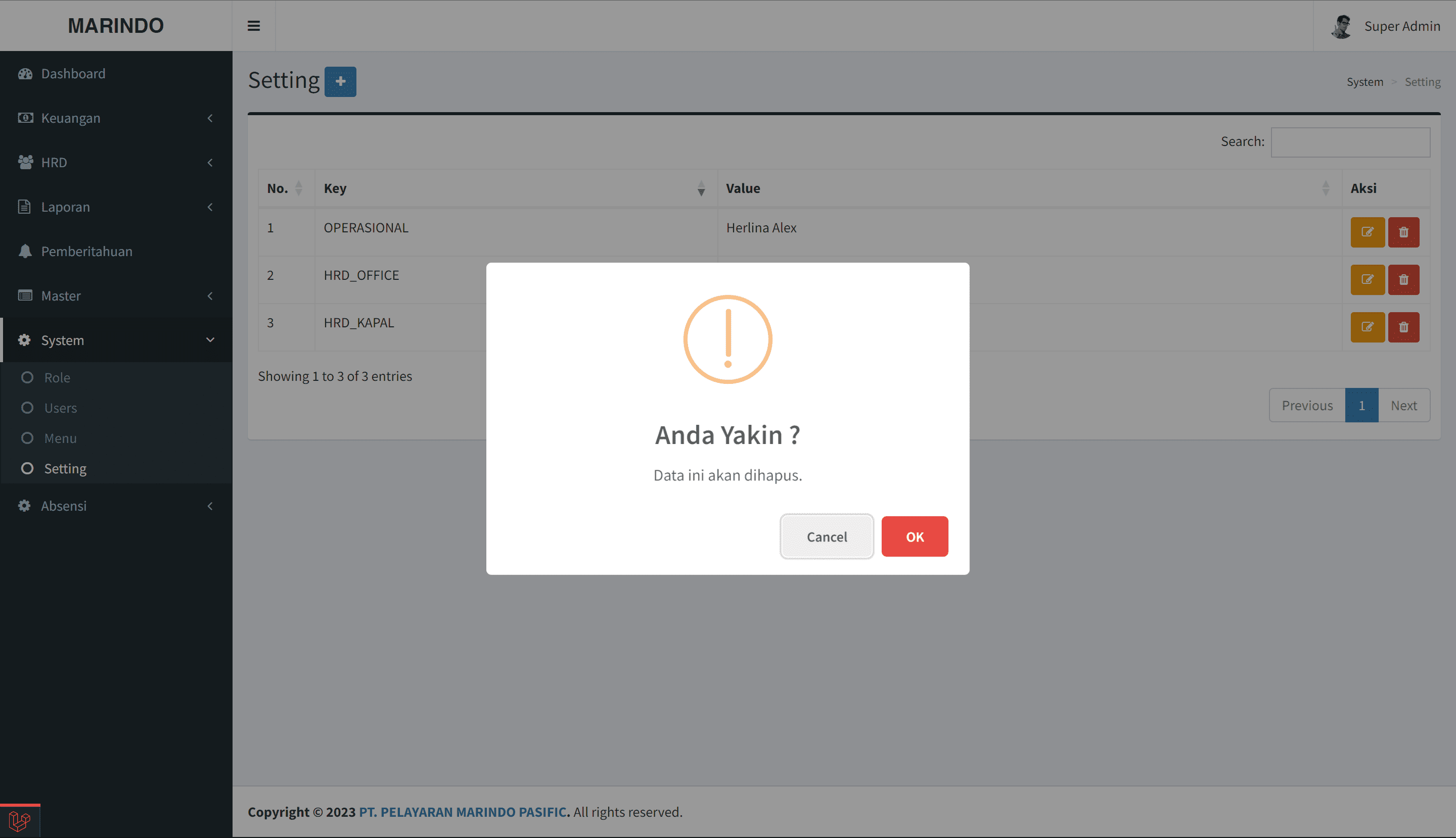 Data pengaturan absensi untuk MARINDO PAYROLL