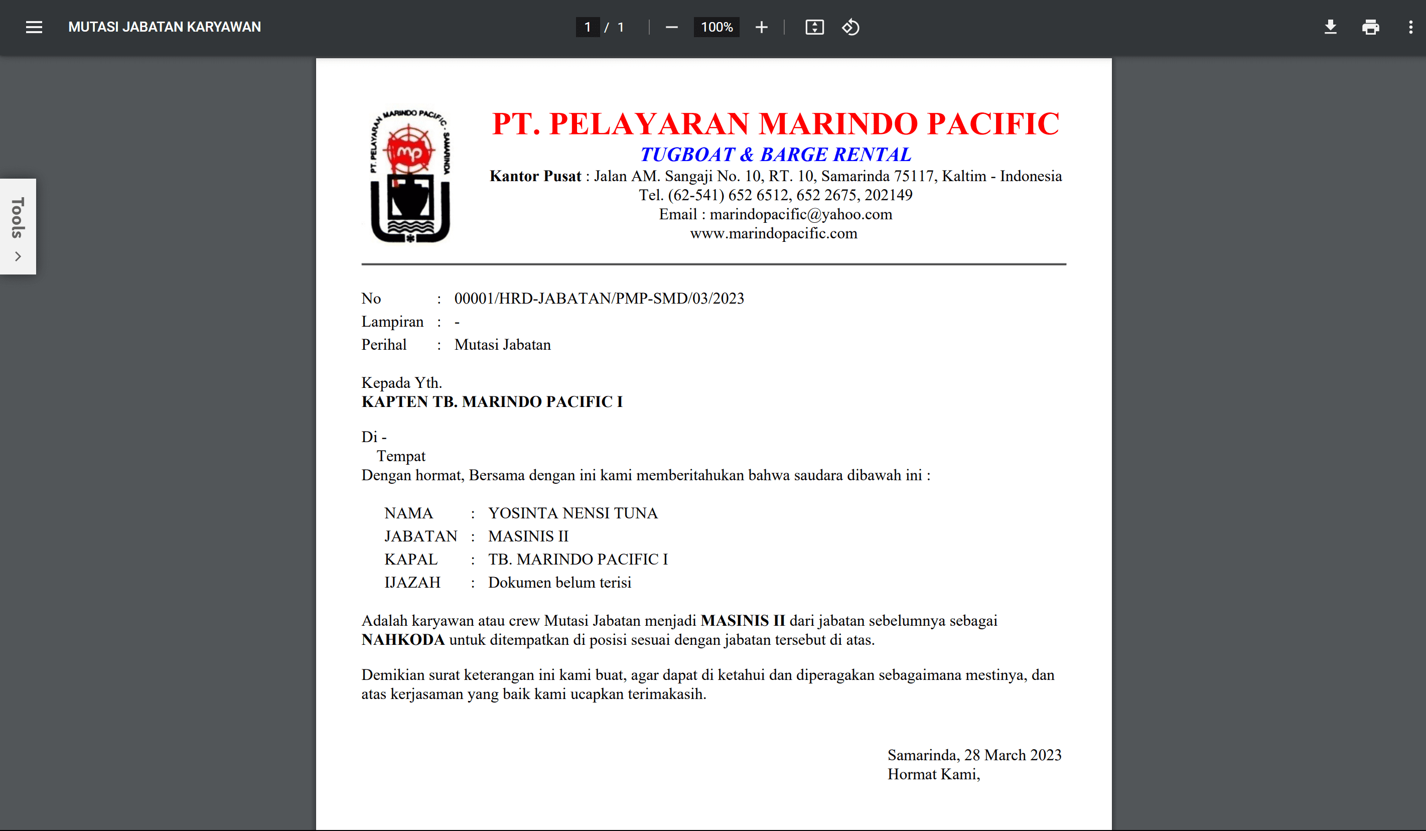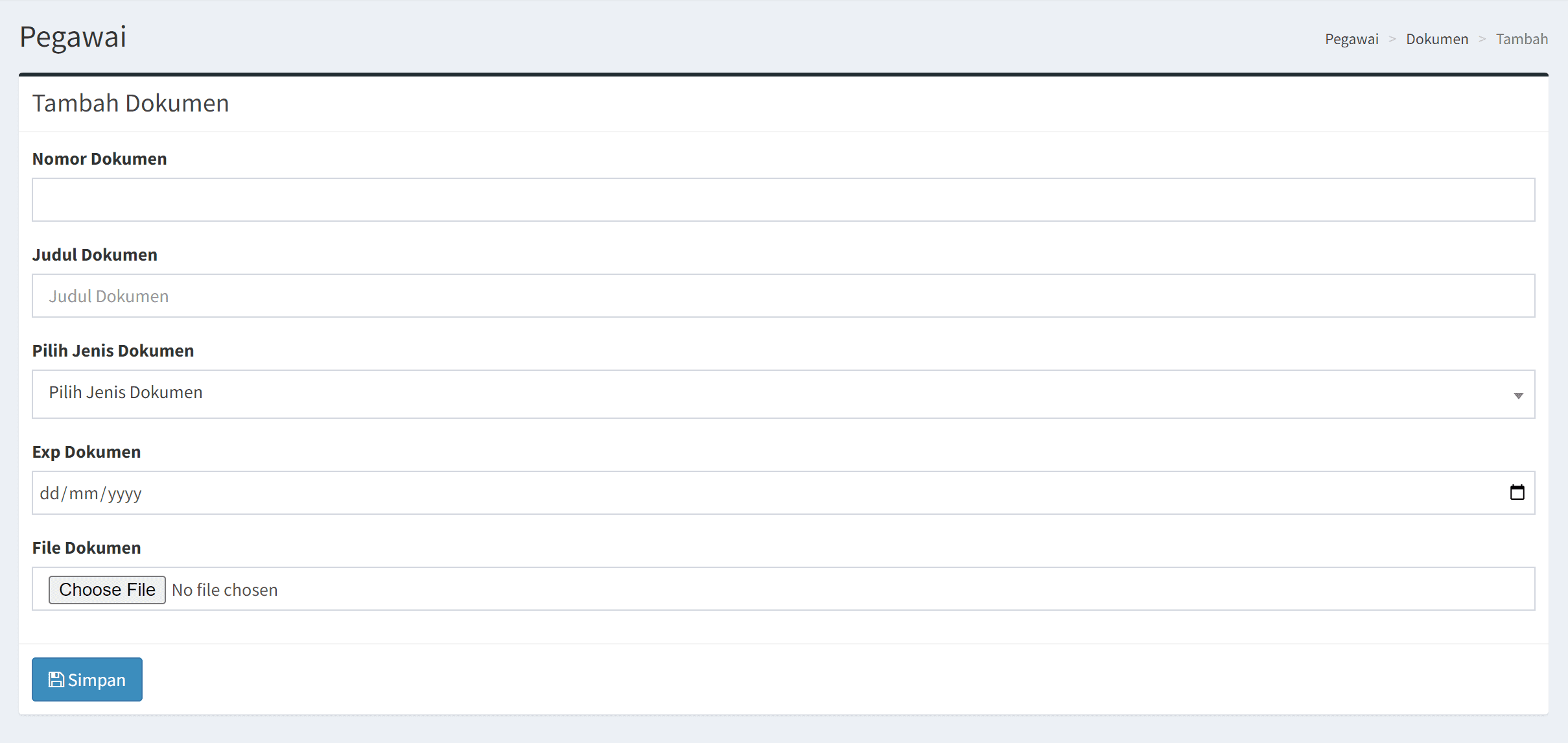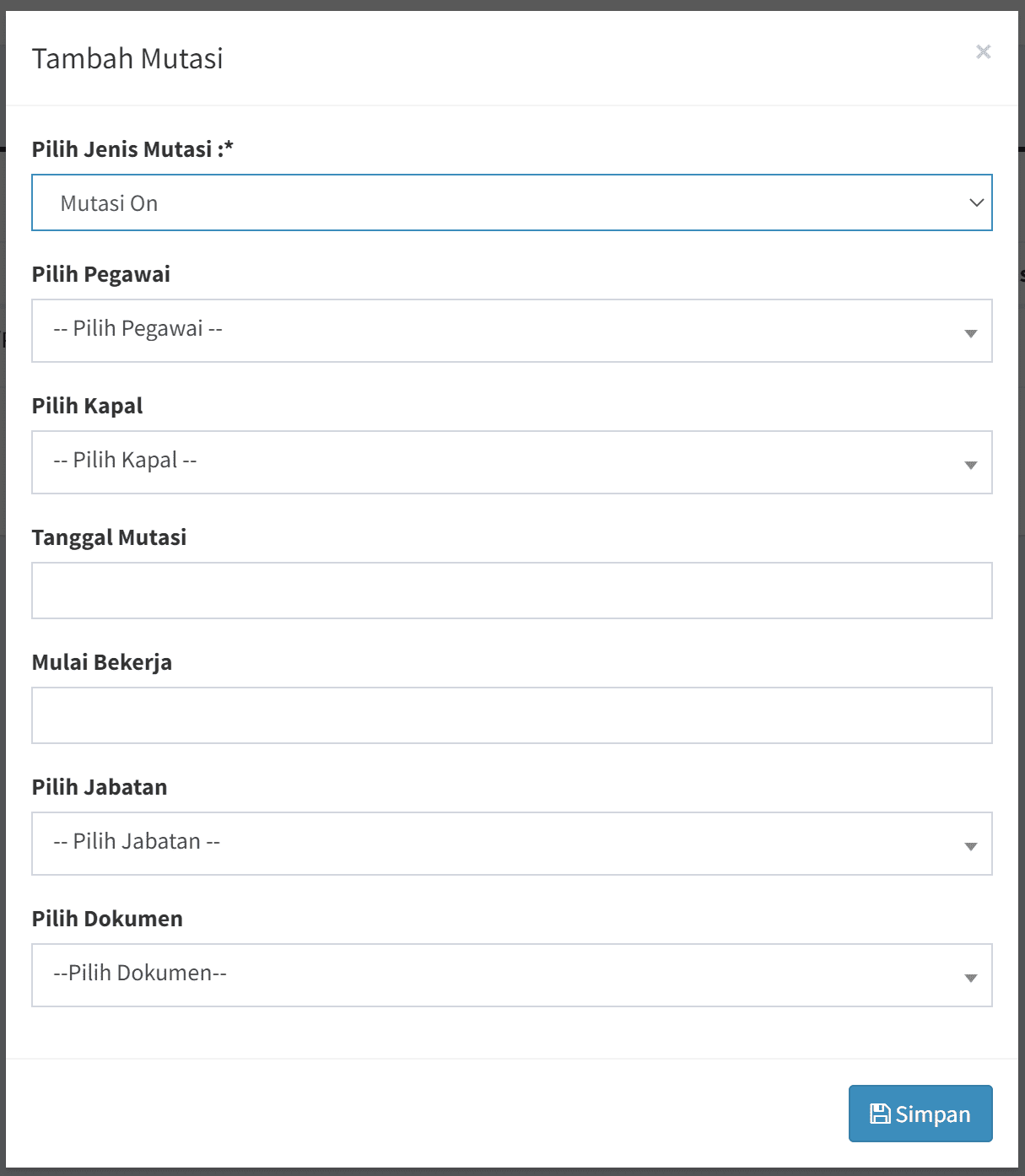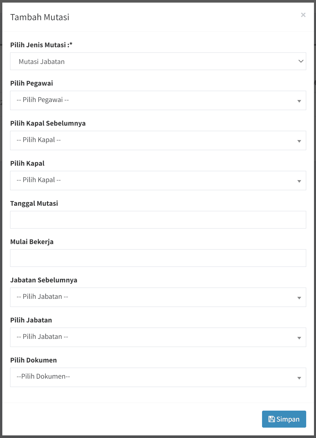 Pilih Jenis Mutasi Jabatan atau Kapal, Pilih Pegawai, Pilih Kapal Sebelumnya (Otomatis memasukkan data Kapal Sebelumnya), Pilih Kapal, Tanggal Mutasi, Mulai Bekerja, Jabatan Sebelumnya (Otomatis memasukkan data Jabatan Sebelumnya), Pilih Jabatan, dan Pilih Dokumen Pendukungdan tekan tombol Simpan -