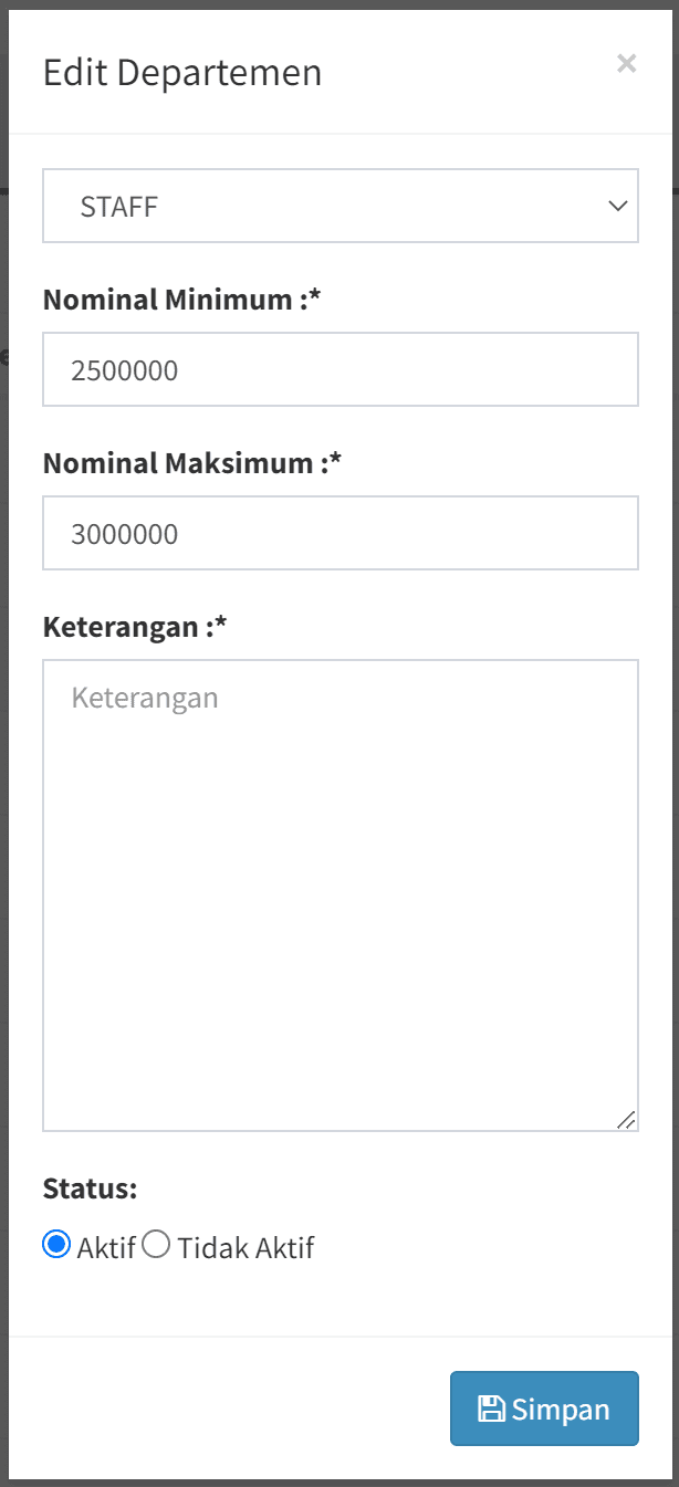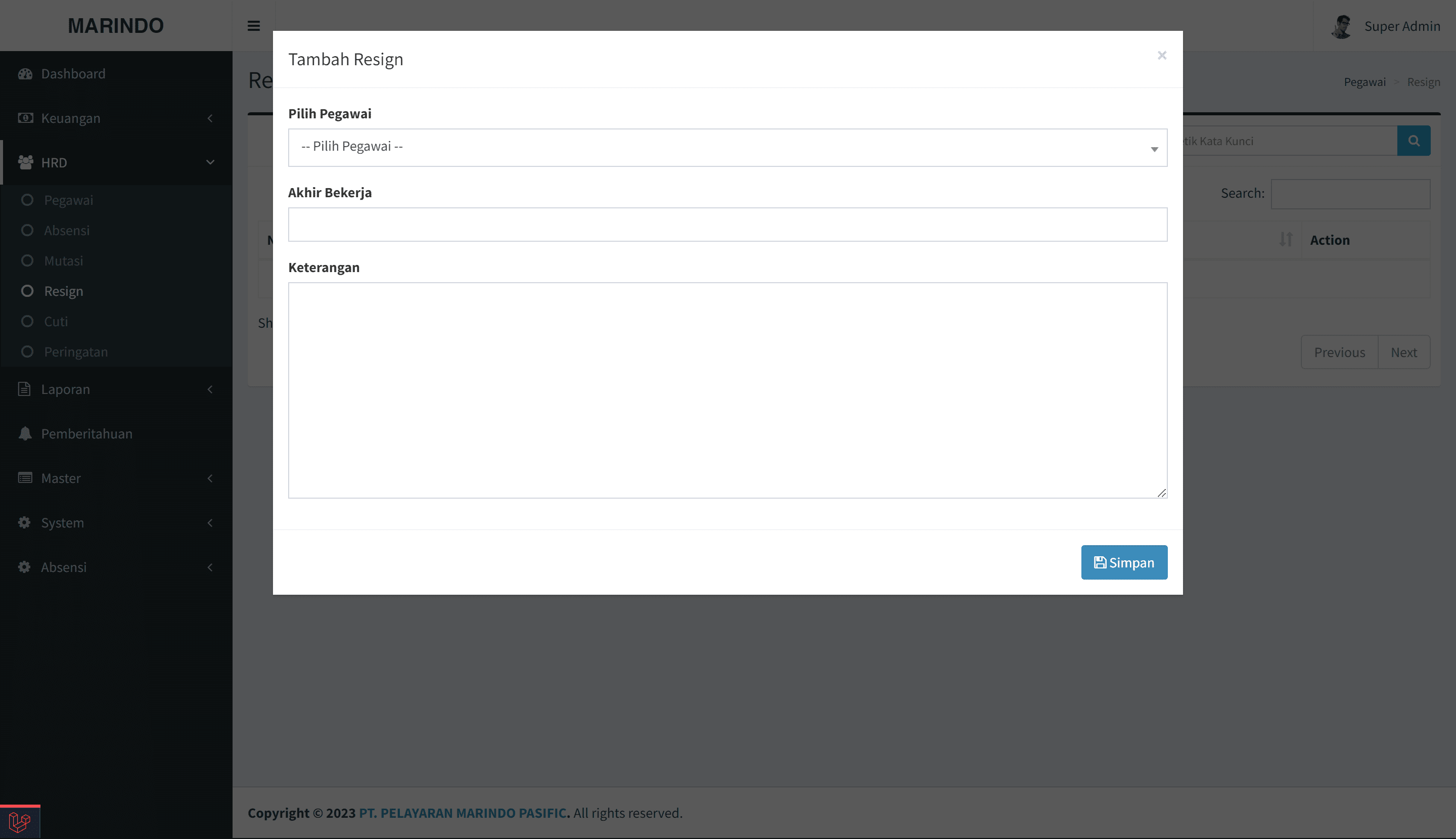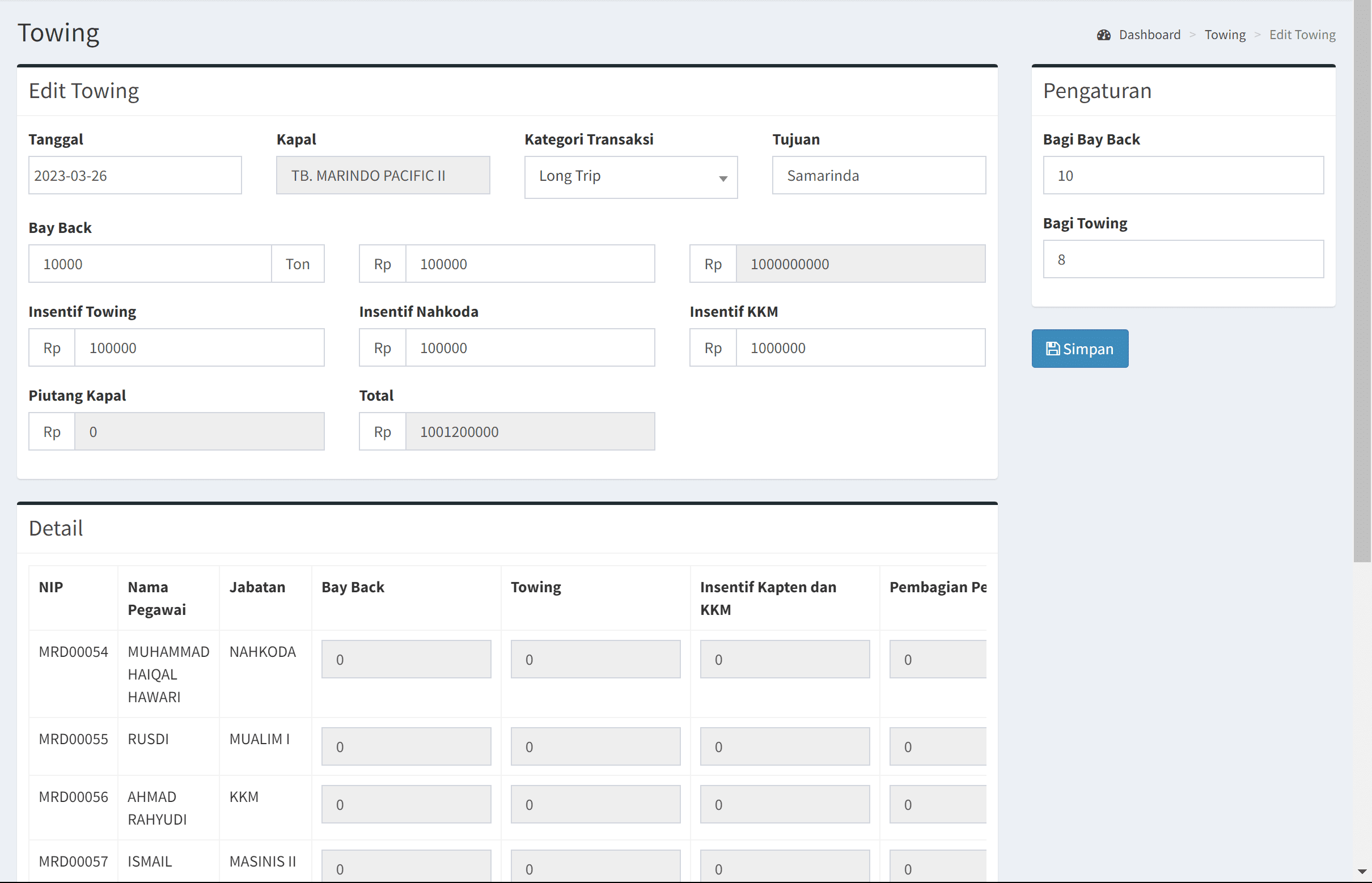Tanggal Masuk (Sudah tidak dapat dirubah), NIP (Sudah tidak dapat dirubah), NPWP, Keahlian Dasar, Pendidikan Terkahir, Lokasi Kerja Pegawai, Pilih Kapal, Departemen, Jabatan, Status Kepegawaian, Status Kawin, Lokasi Pajak, Status Pegawai, Tanggal Keluar (Data ter isi apabila karyawan resign), dan memilih berbagai fasilitas untuk karyawan (BPJS, JKK, JKM, JHT, IP)dan tekan tombol Simpan