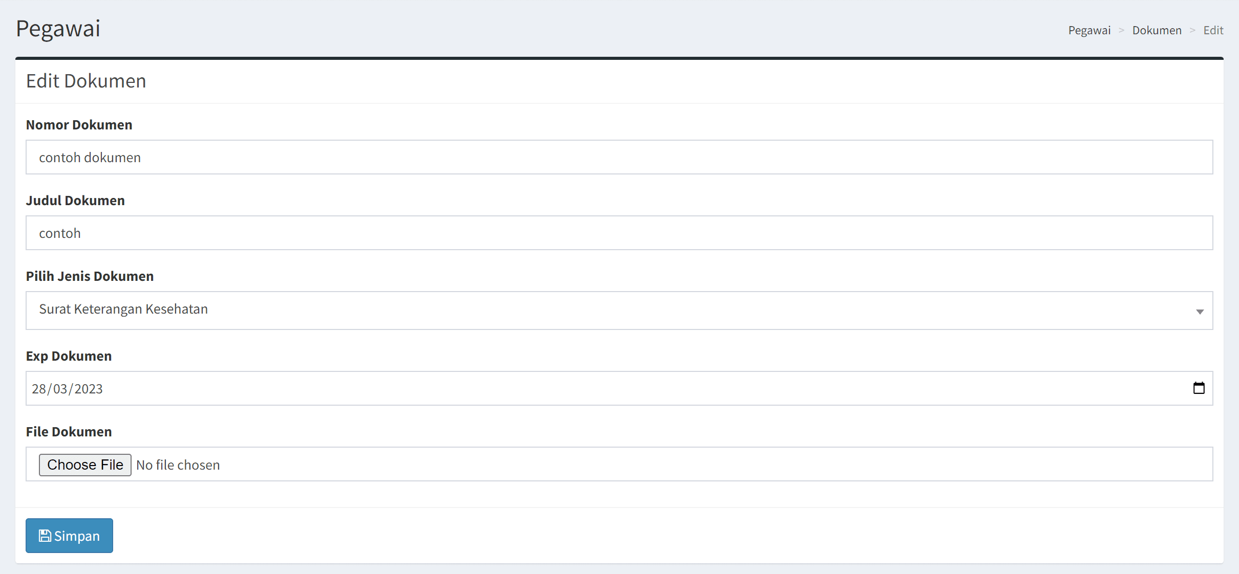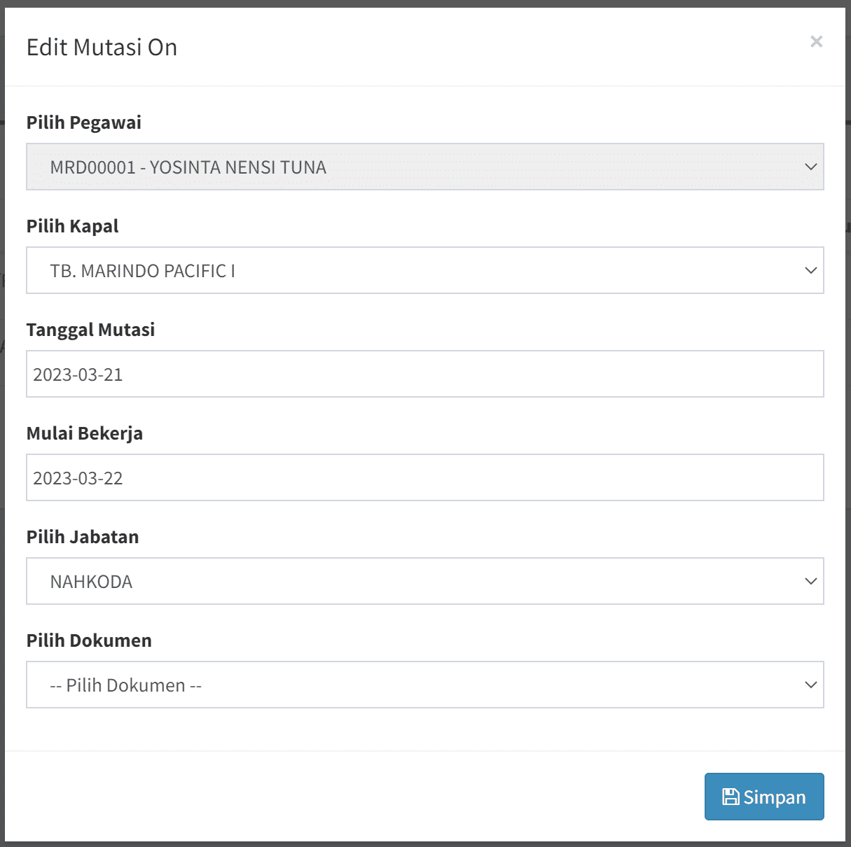 Pilih Jenis Mutasi Jabatan atau Kapal, Pilih Pegawai, Pilih Kapal Sebelumnya (Otomatis memasukkan data Kapal Sebelumnya), Pilih Kapal, Tanggal Mutasi, Mulai Bekerja, Jabatan Sebelumnya (Otomatis memasukkan data Jabatan Sebelumnya), Pilih Jabatan, dan Pilih Dokumen Pendukungdan tekan tombol Simpan -