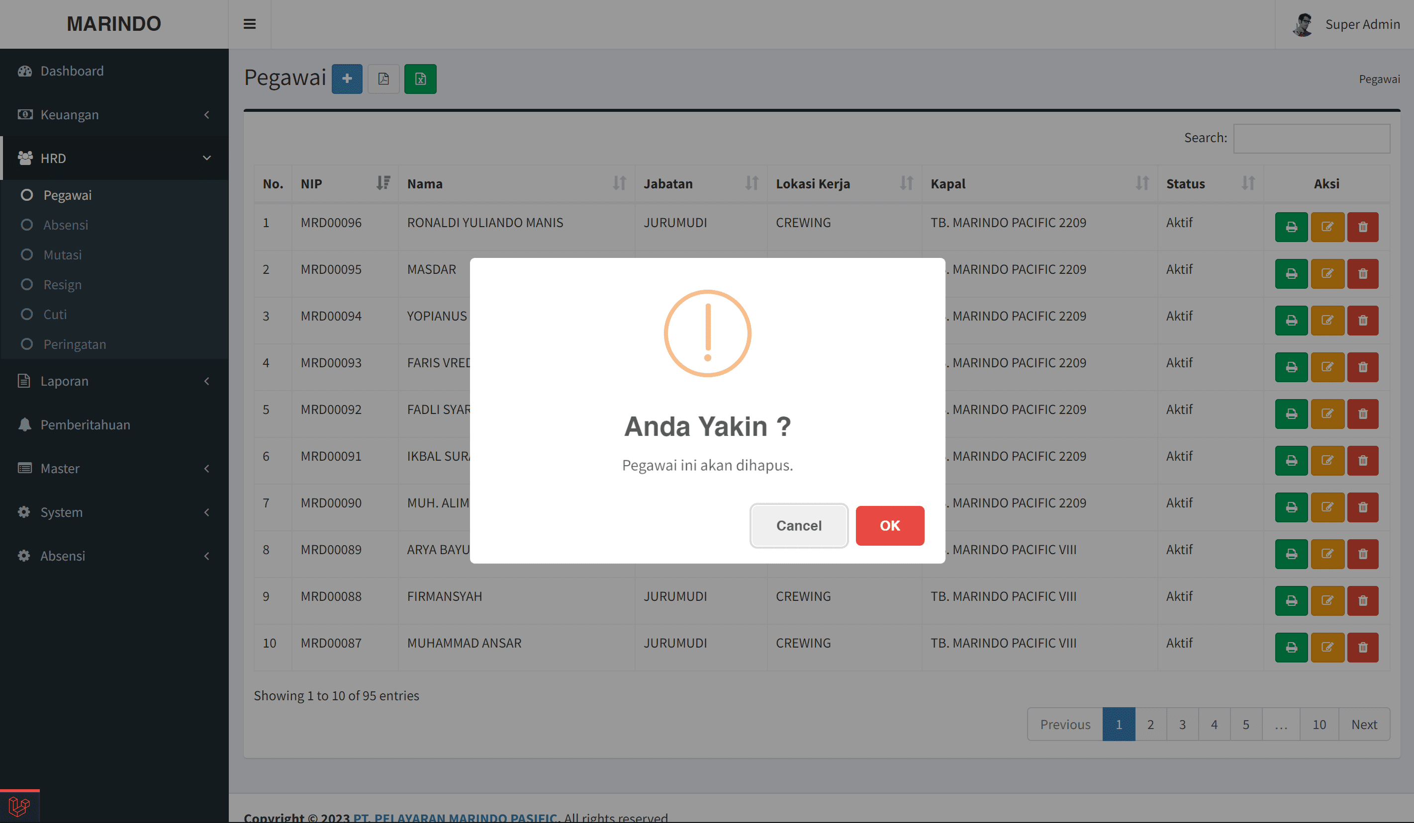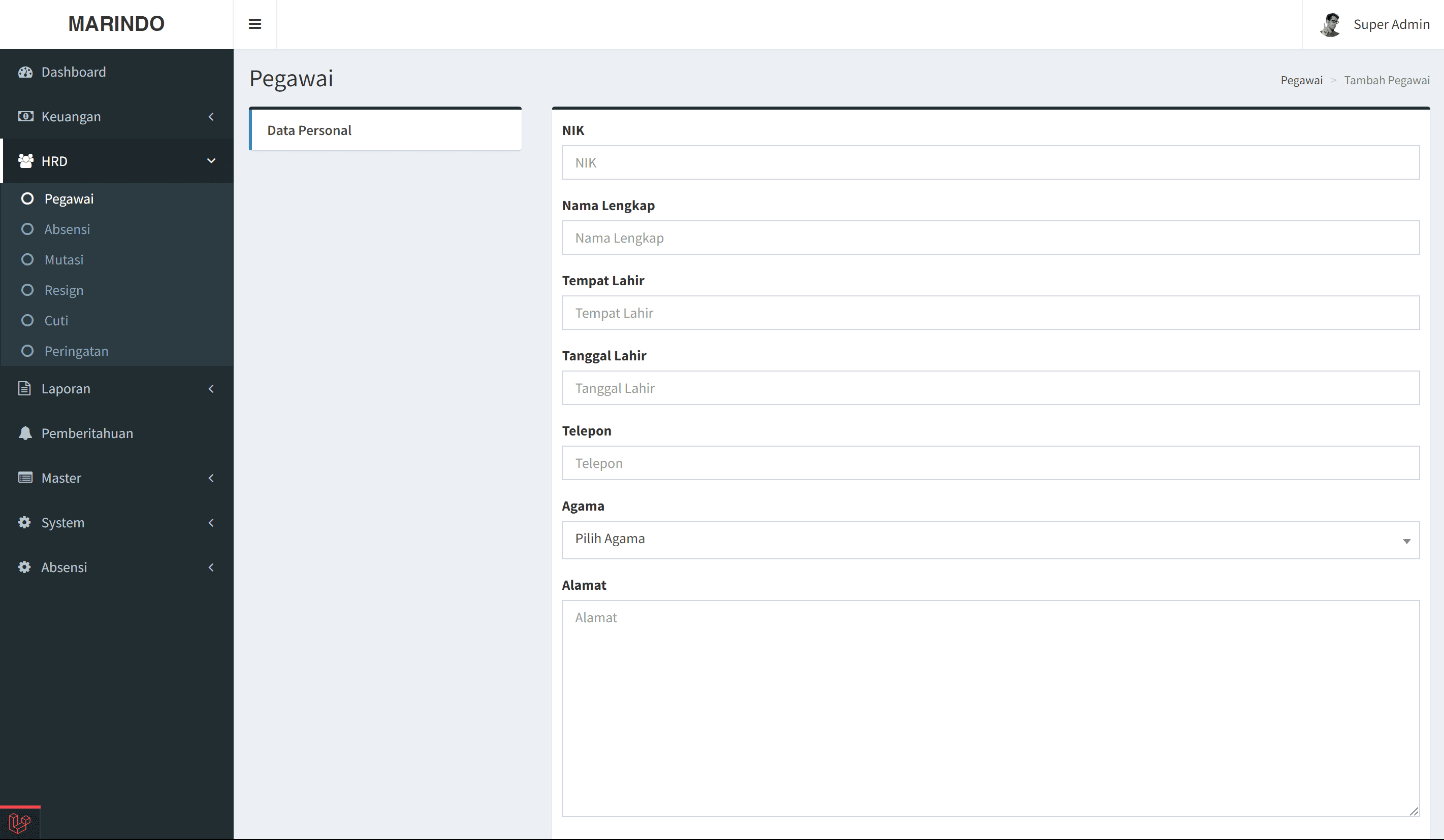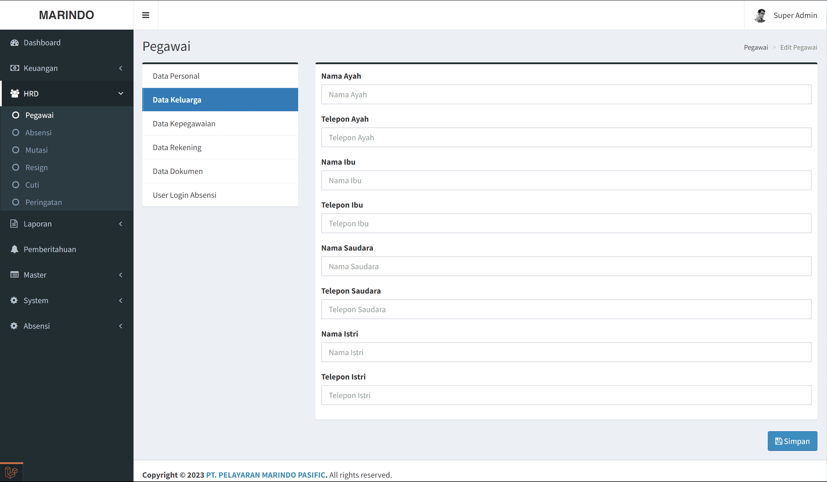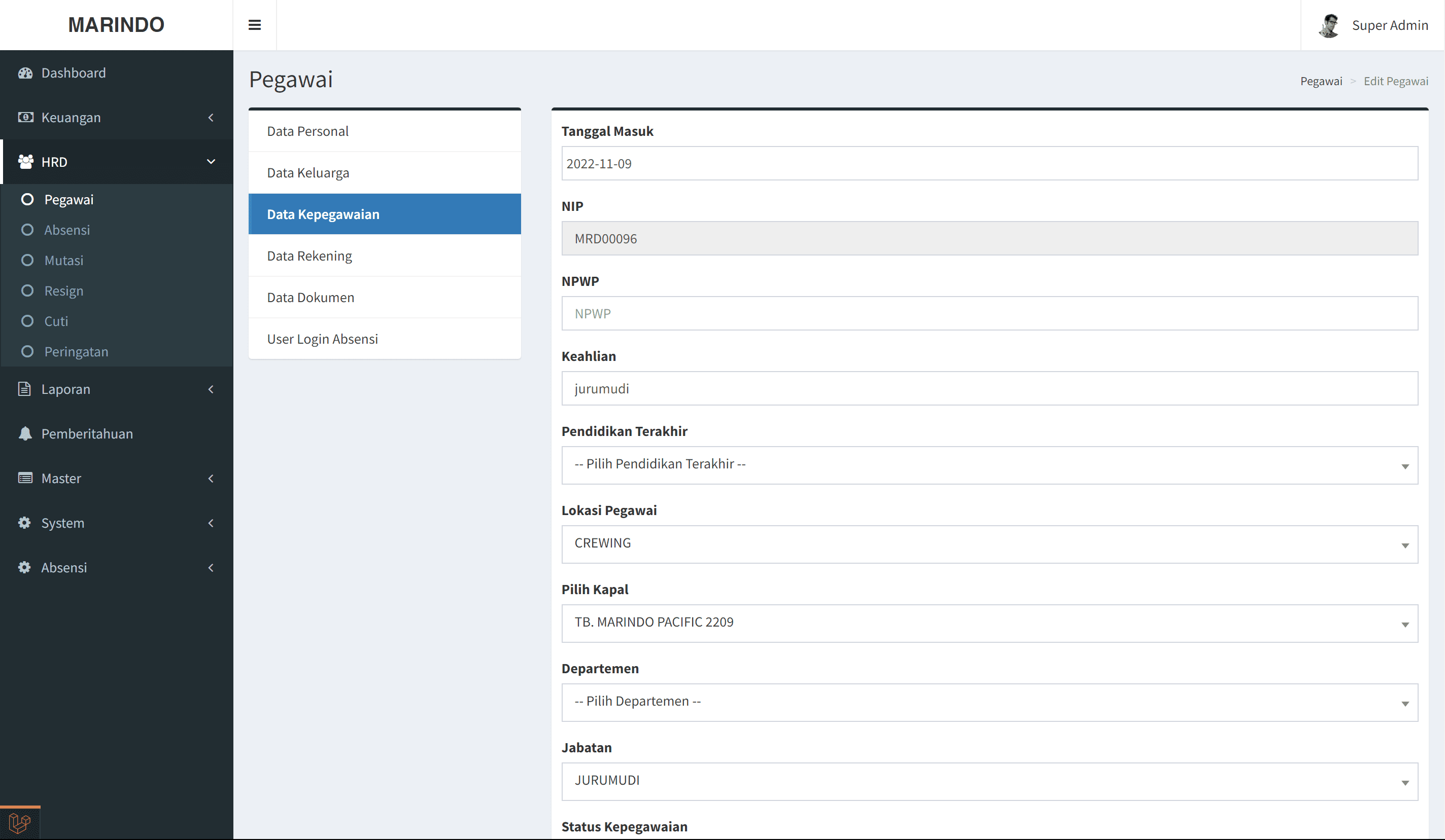 Tanggal Masuk (Sudah tidak dapat dirubah), NIP (Sudah tidak dapat dirubah), NPWP, Keahlian Dasar, Pendidikan Terkahir, Lokasi Kerja Pegawai, Pilih Kapal, Departemen, Jabatan, Status Kepegawaian, Status Kawin, Lokasi Pajak, Status Pegawai, Tanggal Keluar (Data ter isi apabila karyawan resign), dan memilih berbagai fasilitas untuk karyawan (BPJS, JKK, JKM, JHT, IP)dan tekan tombol Simpan