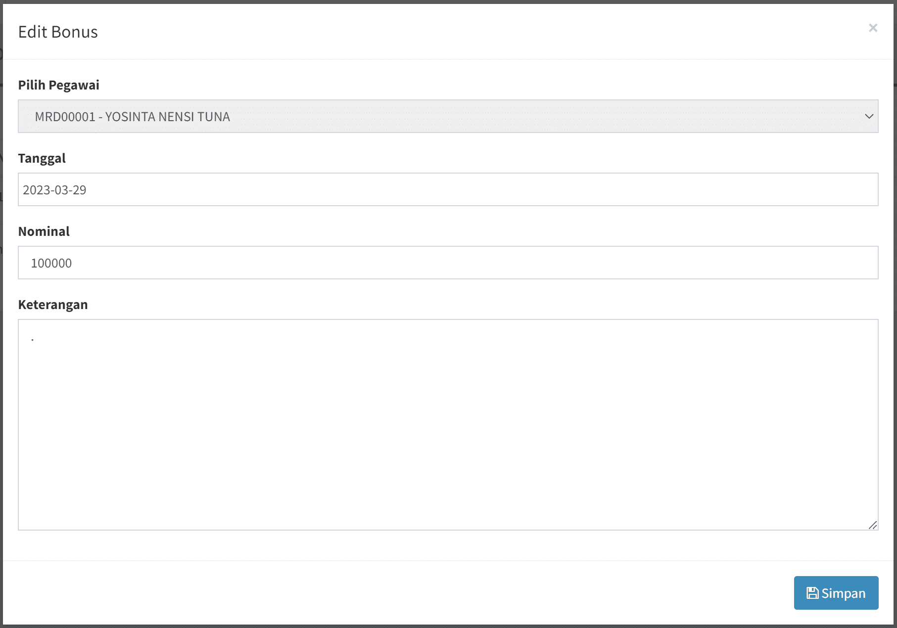 Setelah memilih periode pembayara, maka akan muncul Form Detail Pembayaran, Pada form ini admin bisa