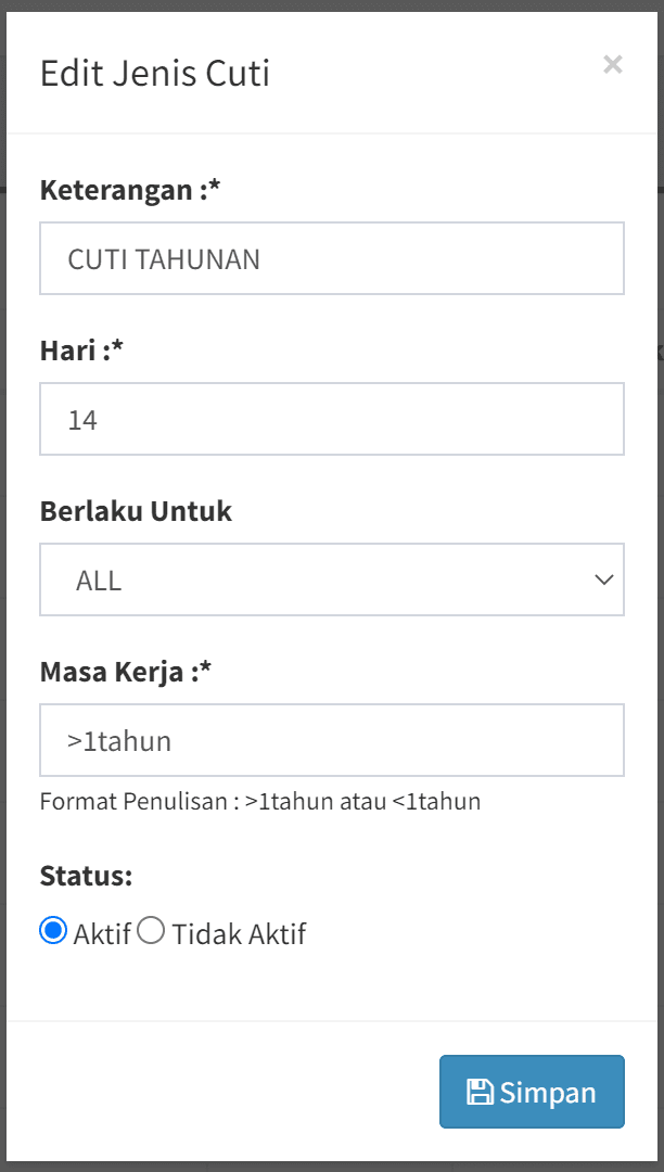 Nama, Tanggal, Type, Shift, Datang, Istirahat Keluar, Istirahat Masuk, Pulang, Jam Kerja, Datang Terlambat, Terlambat Masuk IstirahatPada halaman attedance admin juga bisa mengexport data attendance yang ada ke